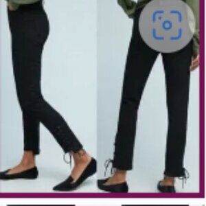 Features: Black Premium Vintage Denim Jeans, High Waist, 5 Pocket Design, Button Fly, Slim Straight Leg Silhouette, Ankle Length with Ties