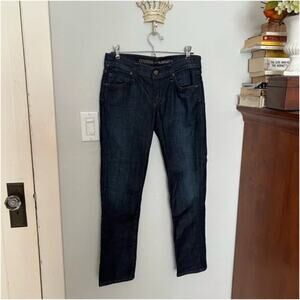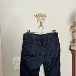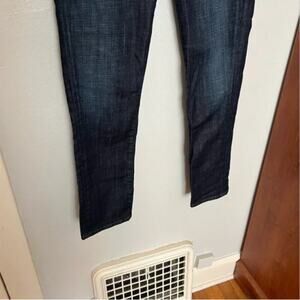 In good preowned condition. Dark wash denim. Can be worn cuffed or uncuffed. Cropped fit.