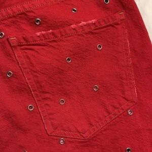 Citizens of Humanity jeans. Red denim with small silver rivets. Five pocket styling. Button fly. Skinny/straight leg. High waist. Intentional rips and distressing. Womens size 25. These jeans are a salesman sample prototype.