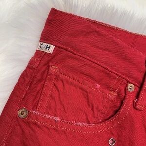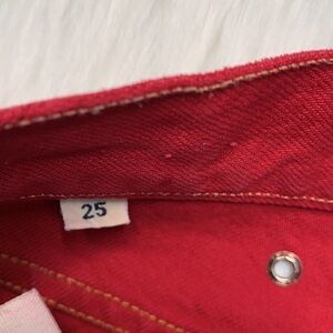 Citizens of Humanity jeans. Red denim with small silver rivets. Five pocket styling. Button fly. Skinny/straight leg. High waist. Intentional rips and distressing. Womens size 25. These jeans are a salesman sample prototype.