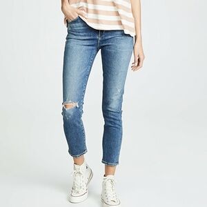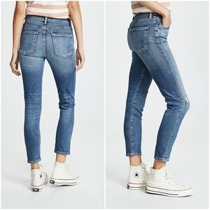 Cut from stretch denim, our bestselling cropped skinny features a clean and classic high-rise. The Reminisce wash is a vintage medium blue with fading throughout the leg and distressing at the knee. High rise skinny.