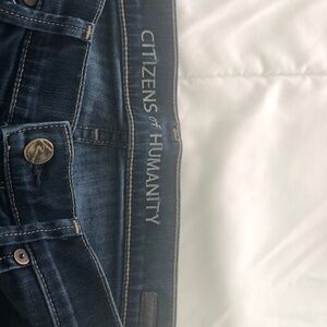 Dark denim jeans. Gently used and only minor wear on the bottom legs as shown and in back pockets. Very comfortable and form fitting.