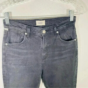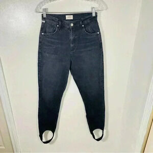 Description: These skinny Citizens of Humanity jeans are crafted from black denim, slightly faded, and styled with elastic stirrups at the cuffs. Mid-weight stretch denim. Subtle fading and whiskering. Button closure and zip fly. Stirrups at bottom. 5-pocket styling.