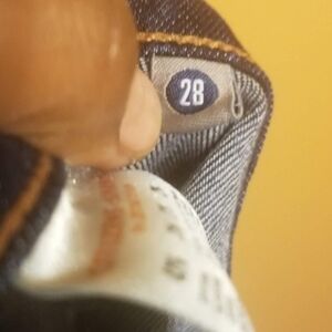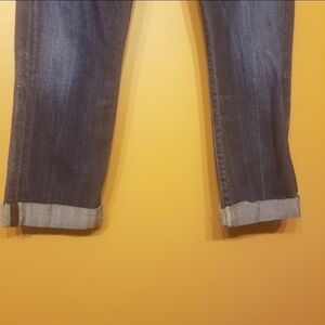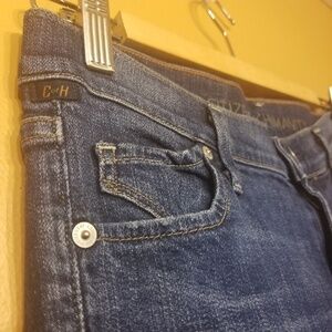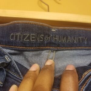 Cropped distressed Citizens of Humanity jeans, size 28. Cropped part of jeans sewn; hems are frayed. Five pockets. Excellent pre-owned condition; distress around pockets and back of legs and one cuff is loose. Please see close up pictures for more details.