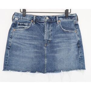 Discover the perfect blend of style and comfort with the Citizens of Humanity mini skirt. This blue denim skirt features a playful frayed hem and a classic 5-pocket design, making it a versatile addition to your wardrobe. The zip closure ensures a snug fit, while the short length adds a touch of fun to your casual outings. Ideal for all seasons, this skirt is perfect for brunch with friends, a day out shopping, or a casual evening event. Machine washable for easy care. Size: 32W. Condition: New, NWOT.