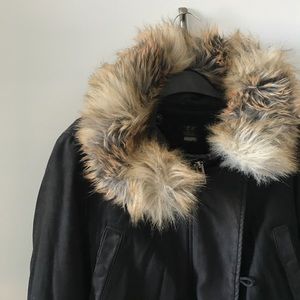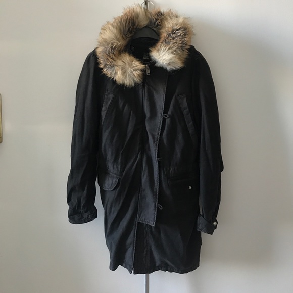 Citizens of humanity black cotton parka with removable faux lambs wool lining and faux fur collar. Warm and practical.