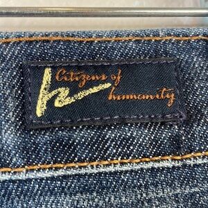 Citizens of Humanity willow creek #098 Low waisted crop stretch jeans size 27 embroidered detailing on pockets. Very 70’s style detailing. Retro distressed style. Dark wash.