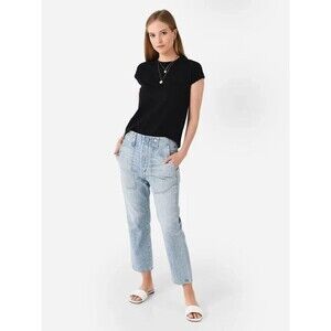 New with Tags, list price $288, Anthropologie Brand Citizens of Humanity women's Faded Light Blue Roma Pony Boy Utility Low Slung Tapered Button Fly Jeans, size 24 x 24 inch inseam, 4 silver button fly front closure, front slash pockets with back patch pockets, mid rise, Relaxed Slouchy Baggy Fit, straight leg with 14 inch leg opening.