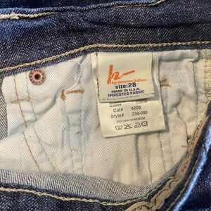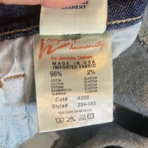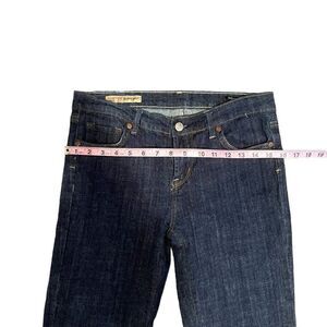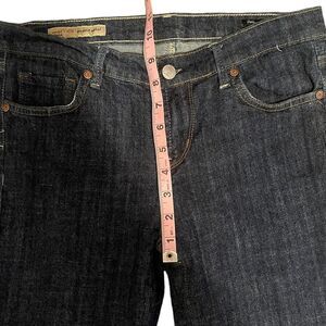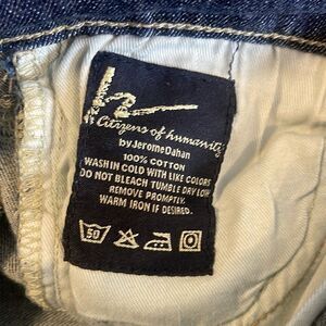 Citizens of Humanity by Jerome Dahan Crochet "H” Bootcut Dark Wash Jeans. Features an extra-dark washed denim with a  a subtle light threaded crosshatching effect to the denim, offering a unique look. Red, navy, and off-white/light blue crochet updates the standard back-pocket embroidery. Low waist bootcut. 100% cotton. In my opinion, these jeans run smaller as a brand. These have no stretch. Measurements in pictures.