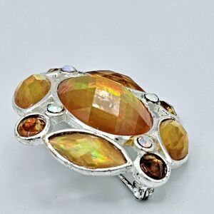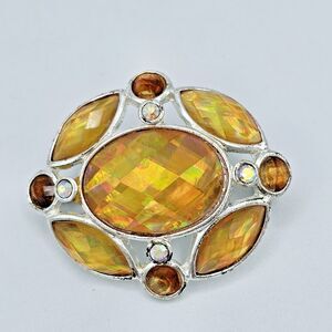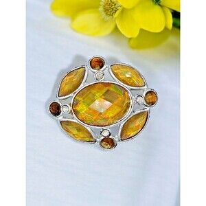Citrine Jeweled Brooch Vintage Fire Gem AB Faceted Yellow Estate Jewelry Pin. Brooch is 1 1/2" x 1 3/4" unsigned. In good pre-owned condition with vintage wear.