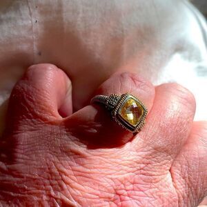 Beautiful gently preloved genuine citrine and diamond ring. I believe it’s a size 7 not 100% sure. Sizable. Two Tone 18k and Sterling Silver