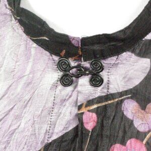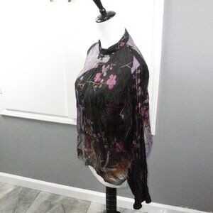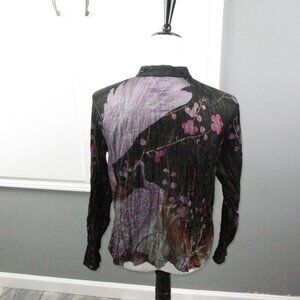 This blouse is in excellent condition. It looks Asian inspired with the floral design and cranes. This is semi-sheer and has three eye-hook closures on the front. The neckline is a tab collar. The material has a crepe like appearance. This is very beautiful.