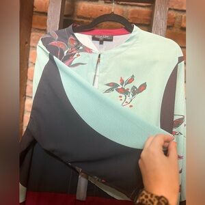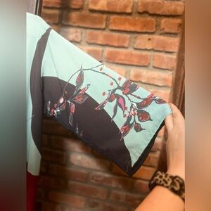 Crepe duster with one-clasp closure and three-quarter sleeves, no stretch, colorblock design with floral print. Shoulder to hem length: 43"