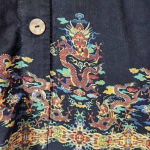 Silk and linen blend tunic with shell buttons. Beautiful dragon motif along the bottom, bright colors.