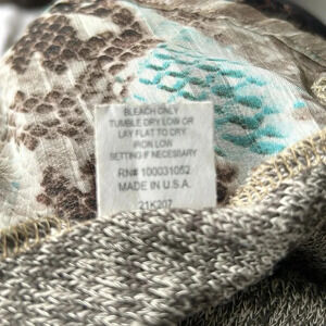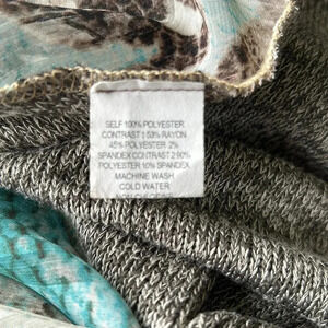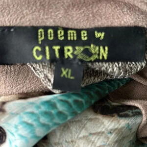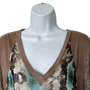 Poems by Citron sweater top in tan and teal snake print. V neck and long sleeves. Asymmetrical hem. Front is semi sheer silky fabric. Sleeves and back are marled knit. Faux sued trim at neckline and shoulders. It’s gorgeous! Bust 24” length 28” - 31”. Excellent condition. Size XL