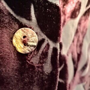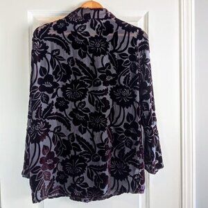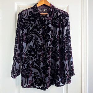 Deep maroon velvet on charcoal grey burnout sheer fabric long-sleeve button-down blouse from Citron Santa Monica.