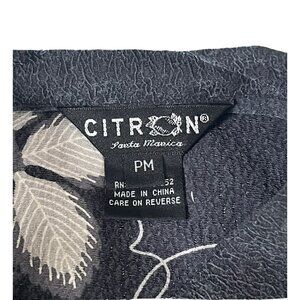 Citron Santa Monica woman's gray Asian floral Foo Dog or Dragon button down the front silk blouse. Blouse has 3/4 sleeves and slits on both sleeves and hem. It's made of 100% silk and is a woman's size PM or Petite Medium.