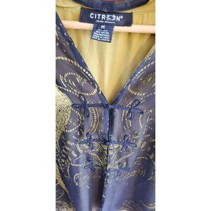 Citron Sheer Black Yellow Bohemian Silk Blend Peacock Print Blouse Medium Luxury
