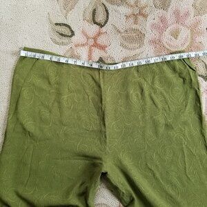 Sadly, the matching pants were so well loved, and expensive, they received one of the most creative repair jobs I've ever seen. But if you look to the bottom right of the outer side of the repair, it's starting to fray, and will soon need additional (iron on?) patching. And the waist elastic is a bit stretched out, but is still functional. If not considered wearable, they are also a yard or more of this lovely green, jacquard silk fabric that can be made into something new.