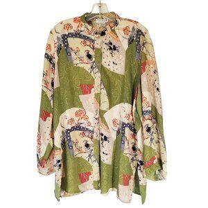 This gorgeous, Asian motif, long tunic shirt has a mandarin collar and shell buttons. Made by Citron of Santa Monica, an interesting company offering beautiful fabrics. 100% silk and could not feel more luxurious. It's machine washable and in perfect condition.