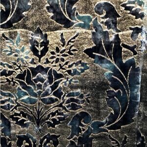 Citron Santa Monica velvet robe in very good condition with little, to no wear and no flaws noted. Robe has velvet material that looks as though it was tie dyed with teal and purple (mostly dark teal) then overlayed with a gold floral pattern. The gold fibers have a different texture and can feel "rough" if rubbed against the nap. The fabric also is iridescent depending on the light. The robe has one cloth closure. It also features a slightly nipped in waist and chest darts for shape and side vents for flow. It is medium weight, has no stretch, and is crisp and drape-y. Measures app'x: 21 inches pit to pit, 20 across waist and 39 long. Sleeves about 22 inches long, unrolled.