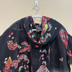 The Citron Women's Multicolor Cowl Neck Short Sleeve Silk Blouse in size M is a stylish and versatile piece perfect for various occasions. Made from lightweight silk material, this blouse features a unique Asian Fans pattern in vibrant multicolor hues, making it a designer and colorful addition to any wardrobe. With a comfortable regular fit and a flattering cowl neckline, this blouse is ideal for summer, fall, and spring, whether worn casually or for a party or cocktail event.