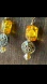 One price gets you the pair of earrings and the stretch bracelet. The handcrafted items are made from glass, metal, and plastic beads. The metal has not been polished. The findings and ear wires are gold-tone metal. The earrings are just shy of 1 1/2 inches long, and the bracelet (unstretched) is approx. 7 1/2 inches around. The colors are orange, silver, yellow, and copper.