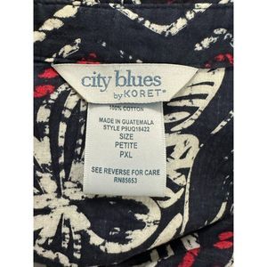 City Blues by Koret Women's Abstract Tropical Button Up 100% Cotton Top, Size PL. Petite Blouse with black background; white and red tropical flower patterns. Excellent pre-owned condition, no rips, tears, snags, pulls, or stains.