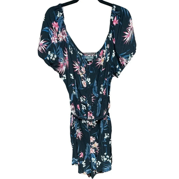City Chic Black Floral Palm Button Front Off the Shoulder Romper Plus Size 24