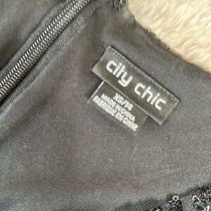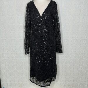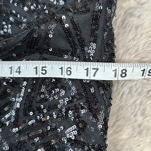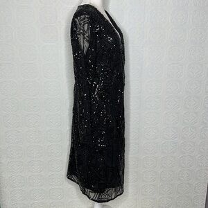 Elegant black dress with shimmering glitter. Features a V-neck and three-quarter sleeves. Perfect for evening wear.