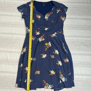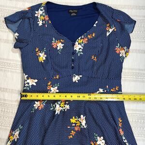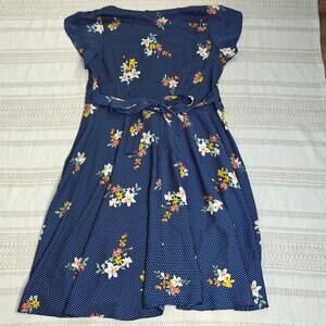 Add a playful yet polished piece to your wardrobe with this City Chic blue floral dress in size 14. This fit-and-flare silhouette features a navy blue base with tiny white polka dots and colorful floral clusters in orange, yellow, and white. The dress has a flattering V-neckline, cap sleeves, and an adjustable tie-waist for a perfect fit. Designed to enhance curves while keeping you cool and comfortable. Never worn and in excellent condition. Perfect for spring, summer, or any casual-chic occasion.