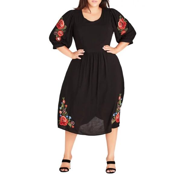 City Chic Embroidered Black Midi Dress – Size 20 – Balloon Sleeves Cinched Waist