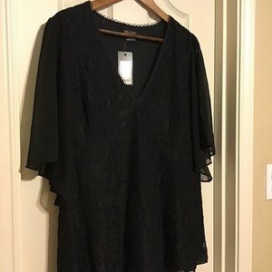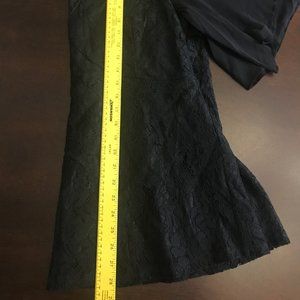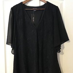 This blouse has sheer, flutter sleeves with a lace body and embellished trim along the V-neck. It is a pull-over style top with elastic on the back waistline.