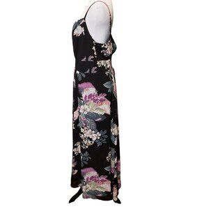 This flowing black maxi dress features an elegant floral print, adjustable straps, and a flattering fit. Ideal for formal or semi-formal settings.