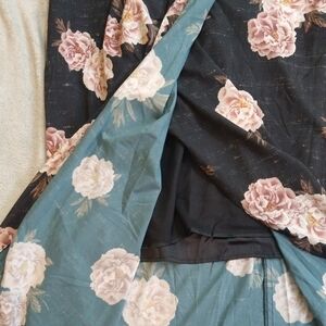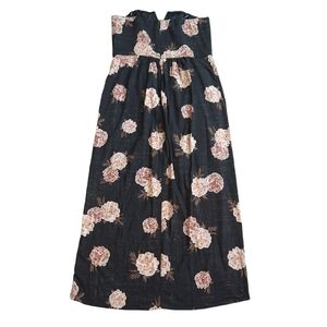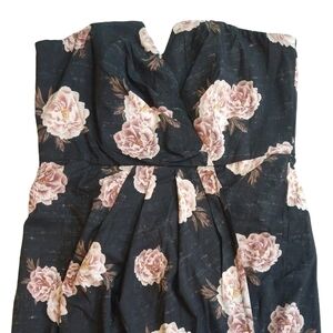 New with tag -- the bottom of the tag is cut. A lightweight strapless maxi dress, faded back (or very dark grey) in color. Has pink florals, a back zipper, a hi-lo tulip hem, and is partially lined.