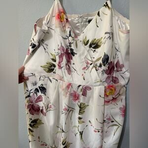 New with tags. Size XXL or 24. Pretty white floral sleeveless midi dress with a tulip hem. Surplice bodice with gathered details. Lined. Back zip. Adjustable straps.