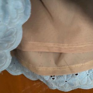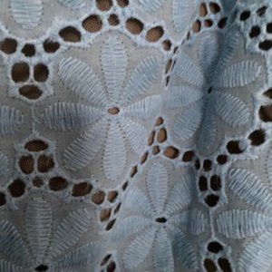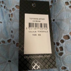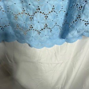 Spring/summer powder blue, cotton lace, fully lined body, off shoulder blouse, with ruffled neckline and scalloped bottom. Flowy, loose fit with 3/4 length sleeves. Sleeves are unlined, straight hem. City chic sizing is unique to them. XS is a 14W, 43" bust. Measurements upon request.