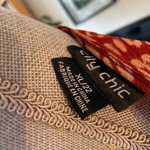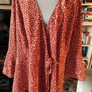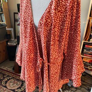 Flutter sleeves. 97% Polyester. Long sleeves. 3% elastane. Rust/burn orange print.