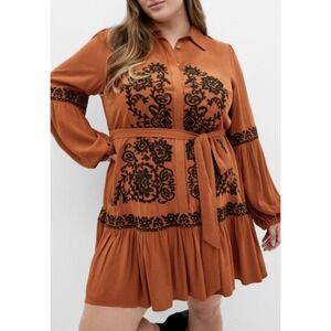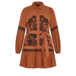 Keywords: City Chic dress, plus size dress, boho dress, bohemian dress, mini dress, brown dress, embroidered dress, long sleeve dress, tie waist dress, frilled hem dress, shirt dress, casual dress, party dress