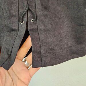 Style and Materials: Short skirt, Black Faux Suede, small front Slit, Polyester. Closure on Back. Hand wash. Comfortable Skirt, Lace up on front details. Fully lined. Y2K, Goth, Wimsigoth, Chic, fanciful, curious, eccentric.