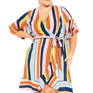 City Chic Wrap Dress Ruffle Sleeve Belted Pink Multi Stripe Women’s Plus Size 24
