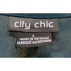 City Chic flutter sleeve top with front working adjustable 1/z zipper. A beautiful color that isn't showing properly in the photos. The color is called "Alpine" and is a very dark teal. Back is semi sheer and front has a lining with a double front hem.