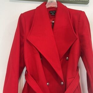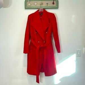Sassy Military Coat in lust red. This standout piece takes the timeless sophistication of military-inspired fashion and reinvents it with a chic, feminine twist. Draped in a lustrous red hue, it’s designed to instantly elevate your wardrobe and turn heads. The standout long lapel collar and striking gold military buttons exude a polished, commanding style, while the self-tie belt cinches your waist to create a flattering, hourglass silhouette that celebrates your curves.