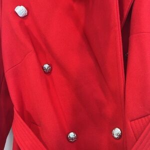 Bold Modern Elegance: The lust red hue, large lapel collar, and gold military buttons exude confidence, making it the ultimate showstopping coat