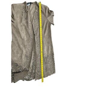 This stylish open-front cardigan showcases intricate laser cut detailing, adding elegance and texture. Made from a polyester-spandex blend for comfort and flexibility.
