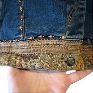 Add a touch of bohemian flair to your wardrobe with this stylish City Girl denim jacket! This women's medium jacket features unique beadwork and trim, making it a standout piece.
