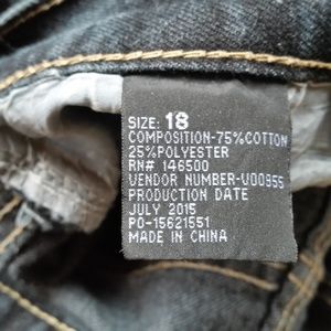 Sexy straight-leg dark-wash City Ink denims in excellent preowned condition. Gorgeous back pocket detailing. Missing one pocket rivet as shown. Size is Junior 18 but measurements equal women's 4. Waist 14", rise 9" and inseam 30".