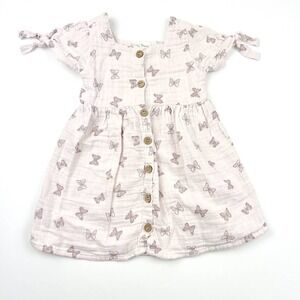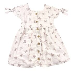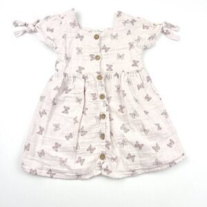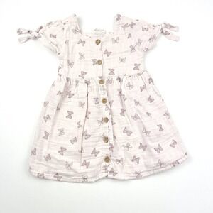 City Mouse light pink shirt sleeved dress with butterfly print. Lightweight organic muslin material. Size 3, GUC for some pulls on the muslin fabric, wash wear.
