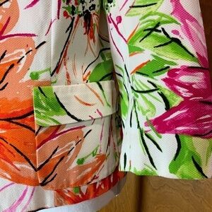 Super cute, stylish, and fun stretch jacket with orange, pink, black, and green abstract floral print. Two button closure. Two flap pockets on front. Three quarter sleeves. Fully lined. Smoke free home.