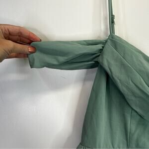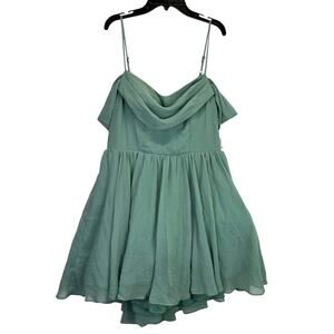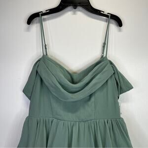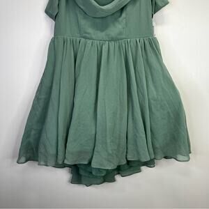 City Studio Draped Off The Shoulder Fit & Flare Dress in Vintage Sage. This dress features delicate spaghetti straps complemented by draped off-the-shoulder sleeves. Crafted from smooth, sheer woven chiffon and is lined for comfort and opacity. The shirred high-low skirt adds a dynamic touch, combining a fitted bodice and waist with a flared, flowing skirt. The back zipper closure ensures a streamlined fit.